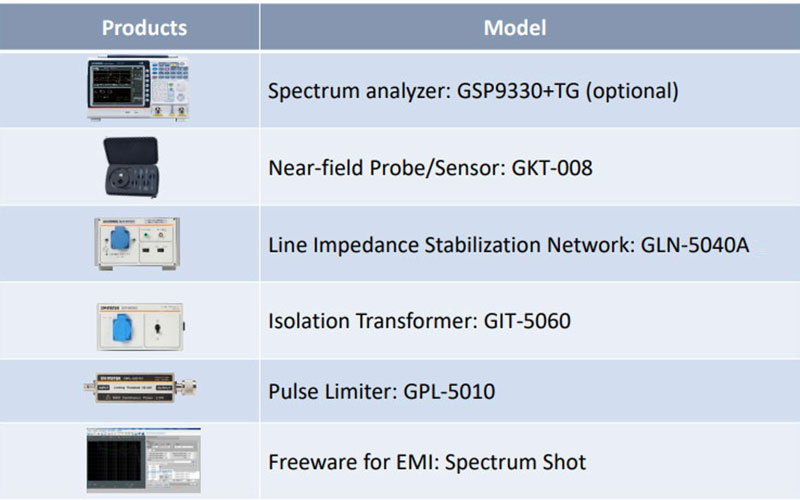 EMC Pre-Compliance Testing Solution comprises GSP-9300 spectrum analyzer, conduction emission and radiation emission testing accessories.